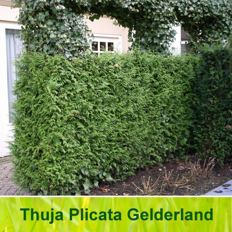 De Thuja Plicata Gelderland is een mooie donkergroene conifeer en geschikt voor een dichte haag. De Nederlandse naam is Reuzenlevensboom. De Thuja doet het goed op vrijwel elke bodemsoort en in Nederland kan hij de winters goed doorstaan. Hij groeit ongeveer 30 cm per jaar.